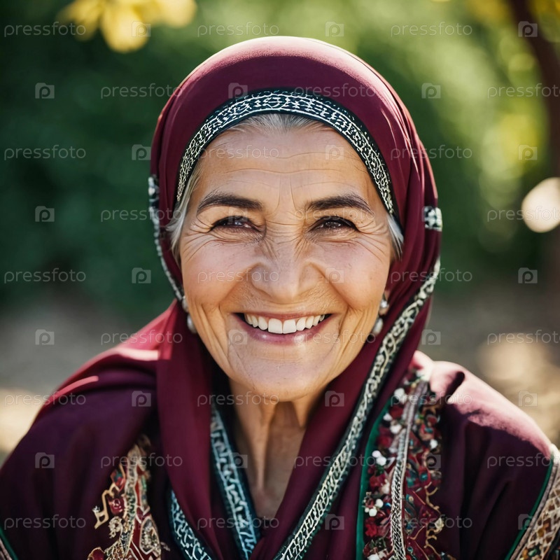 Зрелая таджикская женщина 75 лет улыбается, демонстрируя сложную традиционную одежду и богатое культурное наследие своей национальности, пробуждая мудрость и изящество. Брюнетка, в платке. AI