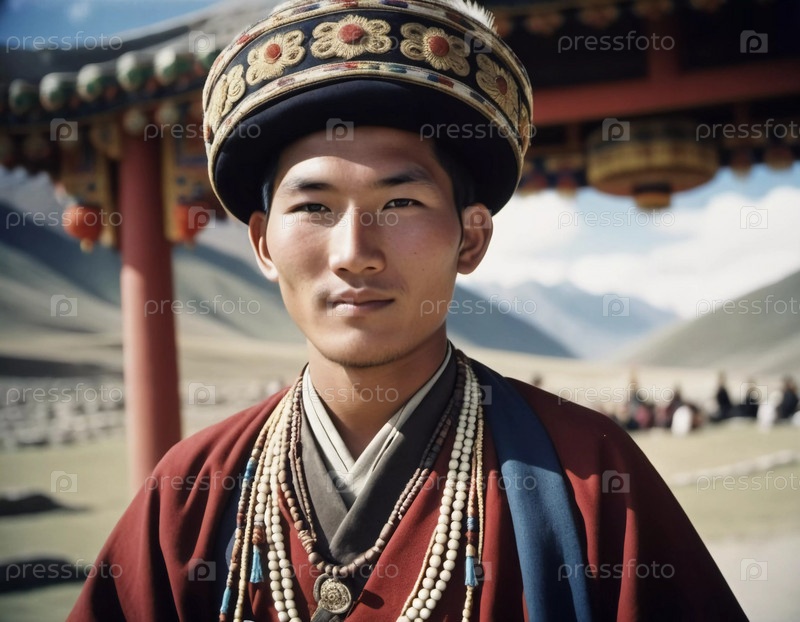 В потрясающем окружении Тибета молодой человек, одетый в традиционную одежду, украшенную замысловатыми украшениями, уверенно смотрит на зрителя, окруженного величественными горами. Генеративный ИИ