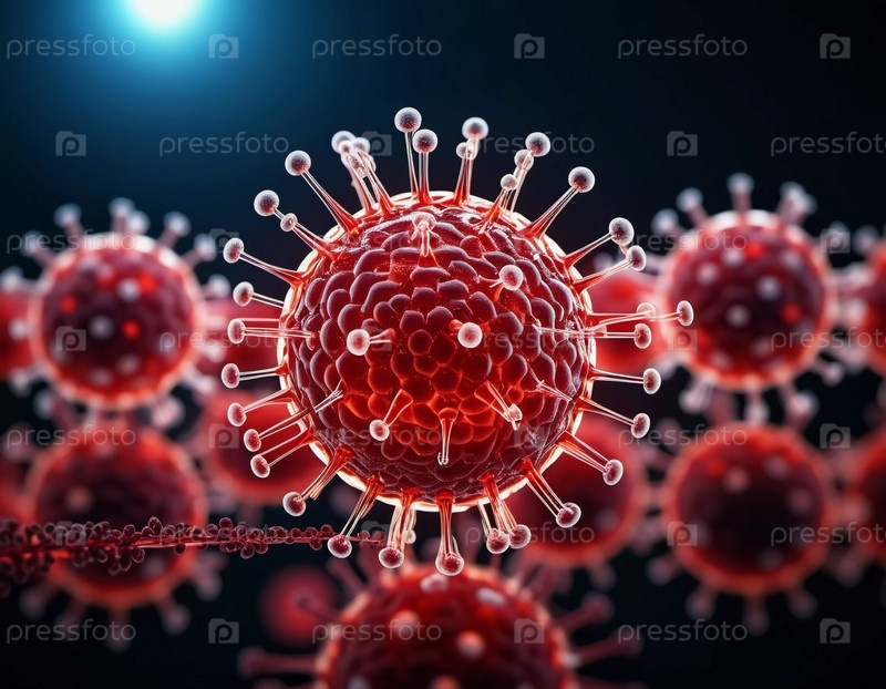 Яркая визуализация ВИЧ, демонстрирующая множественные вирусные частицы. Сложные структуры выделены на темном фоне, подчеркивая их сложность. Вирусология как наука. Генеративный ИИ