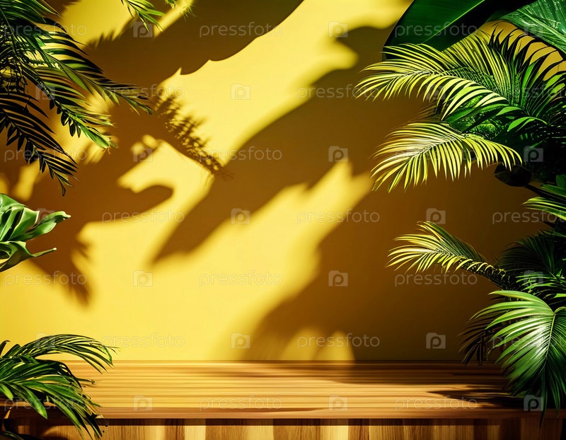 Вид на различные тропические растения с яркими зелеными листьями на ярком желто-оранжевом фоне, создающий живую атмосферу в помещении, наполненную естественным светом. Копировать пространство. Генеративный ИИ