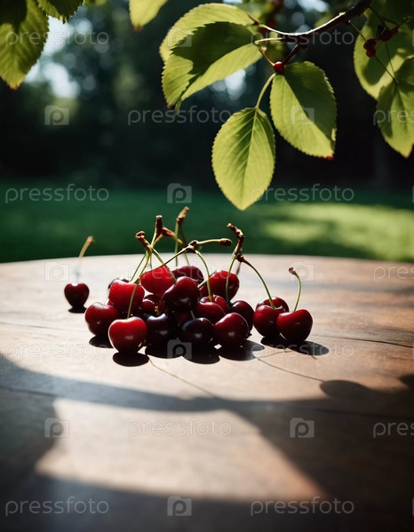 Спелые вишни разложены на деревянном столе под ветвями, полными фруктов, в спокойной обстановке сада, греясь в теплых лучах полуденного солнца, в окружении пышной зелени. Экопродукты. Генеративный ИИ