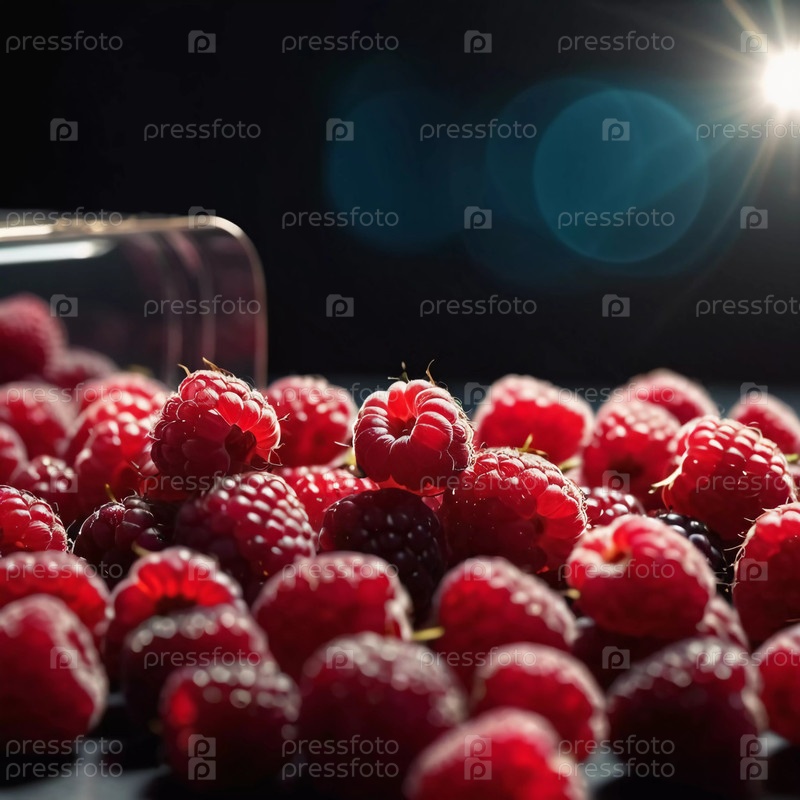 Свежая, сочная красная малина высыпается из стеклянной банки на темном фоне, освещенная ярким прожектором, создавая соблазнительную натюрмортную композицию. Генеративный ИИ