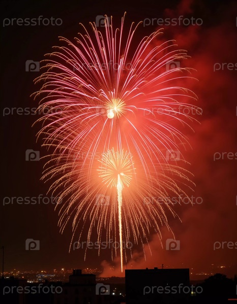 Яркие красные и золотые фейерверки взрываются на фоне темного неба, отражаясь в водном пути. Празднование освещает городской горизонт во время праздничного ночного мероприятия. Генеративный ИИ