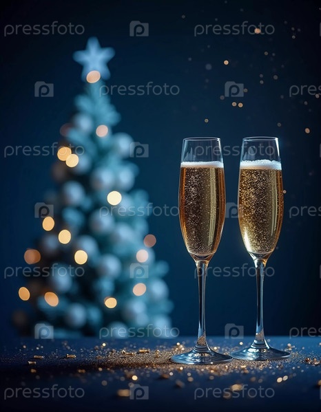 Два сверкающих бокала шампанского элегантно стоят на фоне украшенной рождественской елки, передавая дух праздника золотым мерцанием. Генеративный ИИ