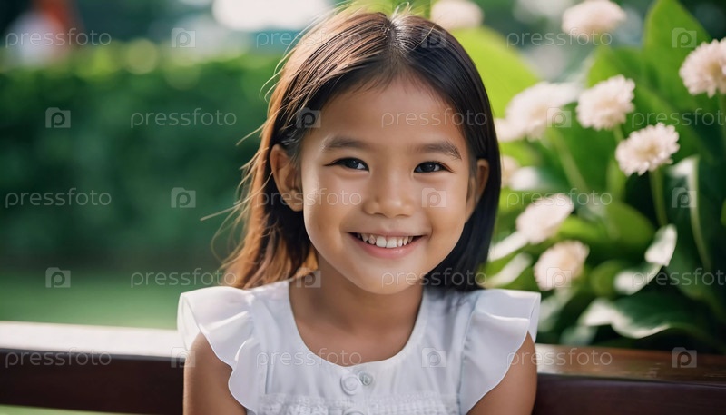Жизнерадостная девушка из Таиланда демонстрирует свою яркую улыбку, сидя на скамейке в окружении пышной зелени и цветущих цветов, запечатлевая восхитительный момент. Генеративный ИИ