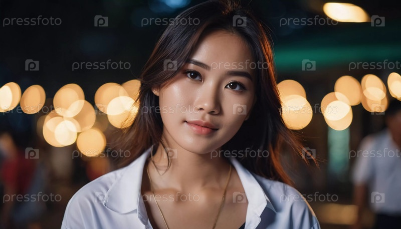 Женщина из Таиланда стоит элегантно, ее спокойное выражение лица контрастирует с живыми огнями боке на заднем плане. Теплая вечерняя атмосфера добавляет очарования моменту