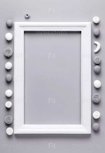Пустая прямоугольная рамка расположена на мягком сером фоне, окруженном круглыми и закругленными серыми и белыми элементами, создающими художественную презентацию