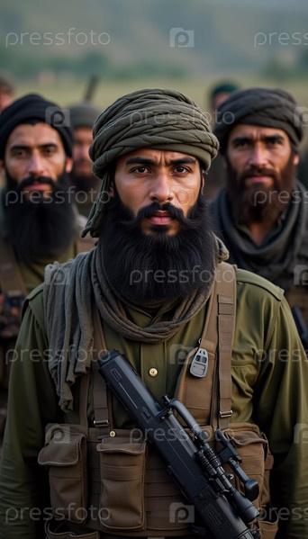 Группа вооруженных мужчин, одетых в традиционную одежду, стоит сплоченно, демонстрируя товарищество и готовность. Воинствующие мусульмане, похожие на Талибан или пакистанскую армию. Густая борода. Генеративный ИИ