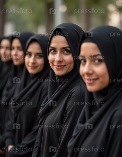 Разнообразная группа мусульманских женщин в красочных хиджабах уверенно стоит вместе. Они делятся улыбками и товариществом, наслаждаясь моментом единения и счастья. Красивые молодые женщины. Генеративный ИИ