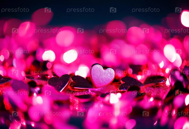 Блестящие розовые сердечки разбросаны по яркому фону, наполненному сверкающими огнями, создавая романтическое настроение для празднеств и торжеств в честь Дня святого Валентина. Генеративный ИИ