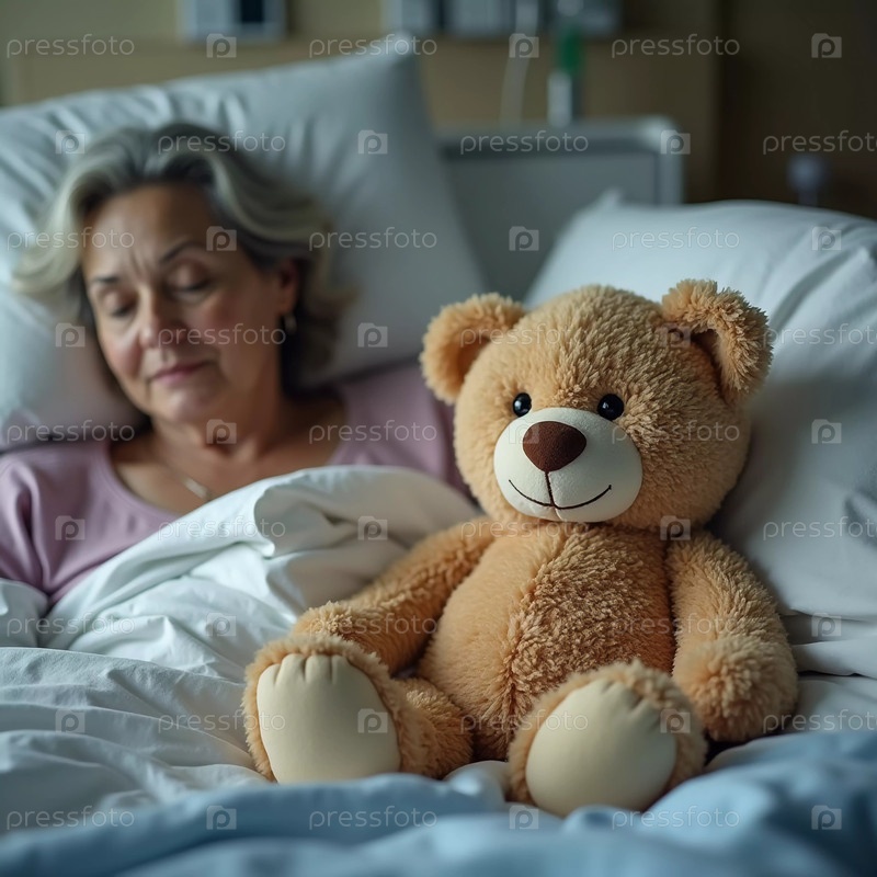 В тихой больничной палате пожилая женщина мирно отдыхает, рядом с ней ее плюшевый мишка. Мягкая игрушка обеспечивает комфорт и компанию в ее непростое время ухода