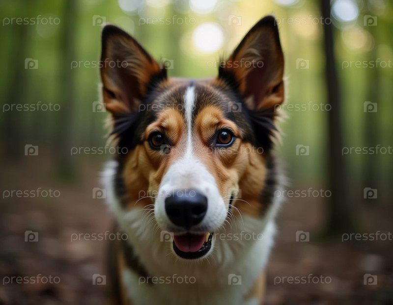 Игривая собака пристально смотрит вперед, окруженная пышной зеленью и пятнистым солнечным светом, пробивающимся сквозь ветви деревьев. Лес предлагает мирный фон для этого любопытного момента AI