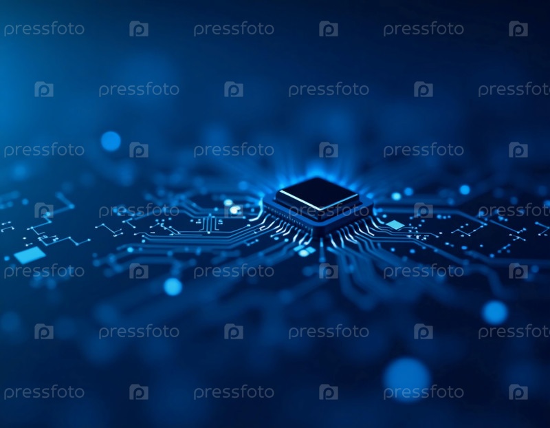 Замысловатые узоры микрочипа возникают на фоне электрически-синего цвета, символизируя динамичный мир искусственного интеллекта и современных технологий без ограничений. Генеративный ИИ