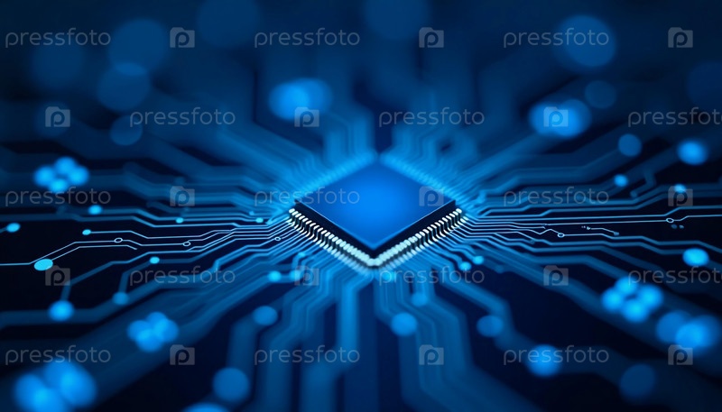 Яркий синий микрочип находится в центре сложной сети схем, пульсируя энергией, пока данные проходят через соединения на фоне темно-синего света. Генеративный ИИ