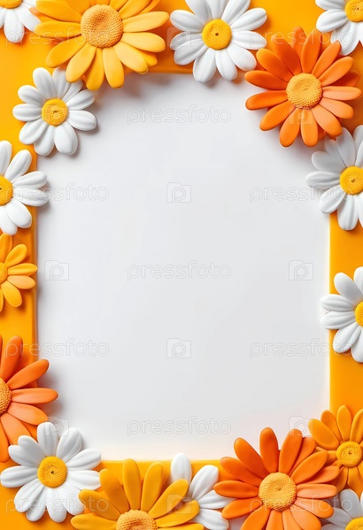 Яркие ромашки сияющего белого, оранжевого и желтого цветов образуют живую рамку, приглашая к всплеску творчества в пустом пространстве, наполненном летним настроением