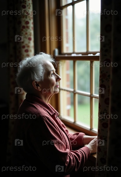 Пожилая женщина задумчиво смотрит из окна, залитого мягким светом. Окруженная цветочными занавесками, она наслаждается моментом спокойствия и размышлений в своем уютном доме Generative AI