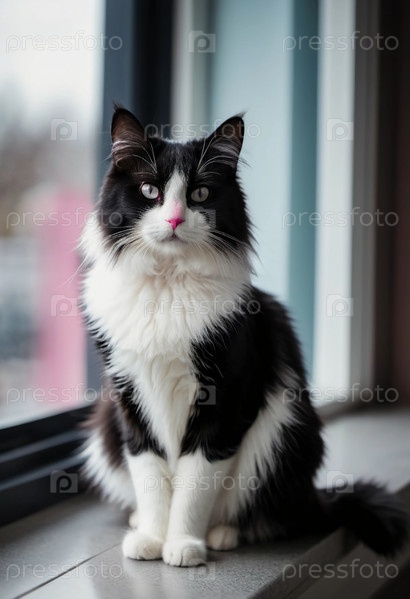 Кошка с эффектным черно-белым мехом элегантно сидит на подоконнике, глядя на яркий пейзаж за окном, погруженная в свои мысли, пока внутрь проникает мягкий дневной свет