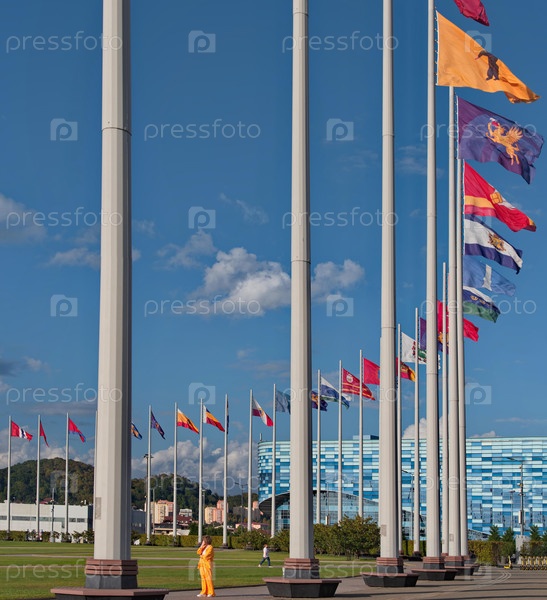 Россия, Сочи. Октябрь 08, 2024. Живописная центральная площадь Олимпийского парка окруженного множеством флагштоков с развивающимися флагами