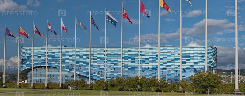 Россия, Сочи. Октябрь 08, 2024. Живописная центральная площадь Олимпийского парка окруженного множеством флагштоков с развивающимися флагами