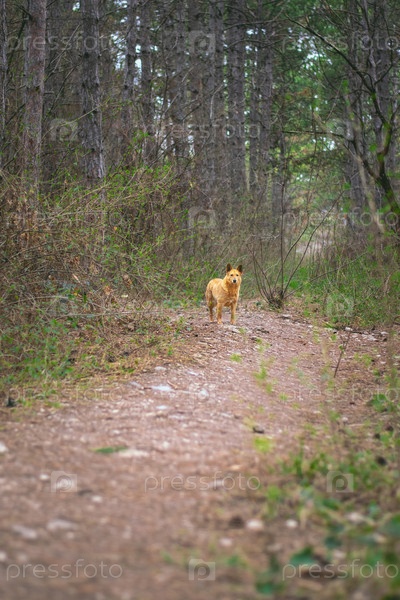 Собака стоит в лесу