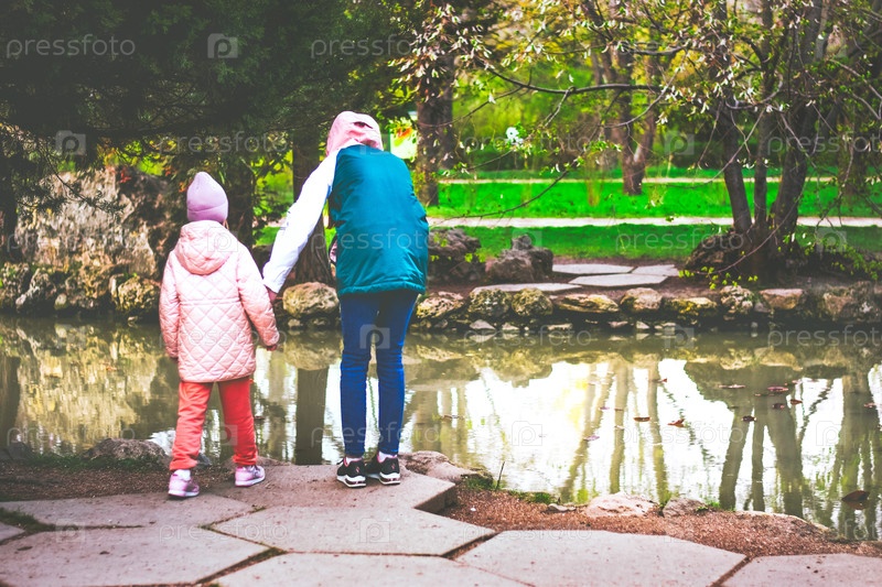 Мама и дочка подходят к пруду