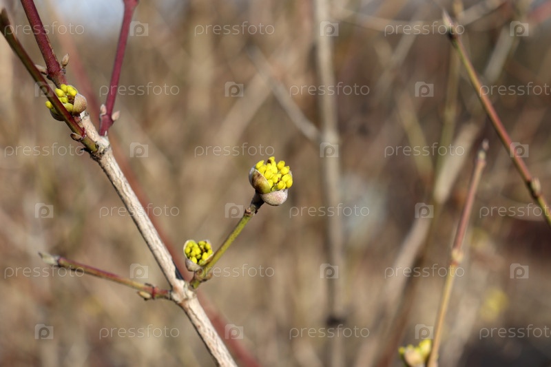 Распускающиеся бутоны на кусте кизила в саду в солнечный день