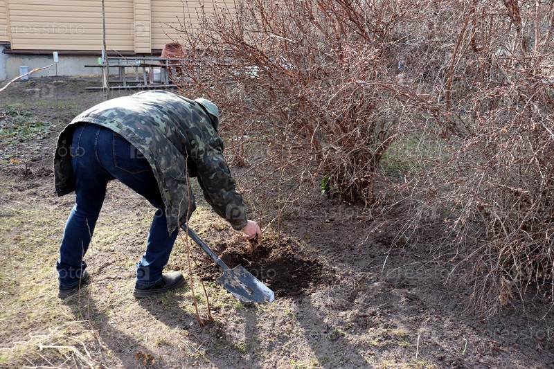 Пожилой мужчина наклонился, прикапывая ветви куста жимолости в саду весной