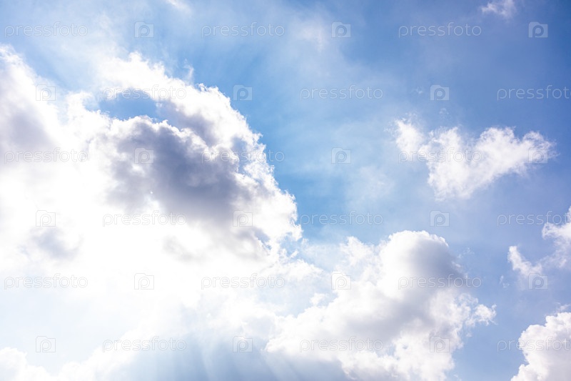 Красивые кучевые облака с солнечным светом. Прямые лучи солнца пробиваются сквозь облака. Тишина природы, атмосфера неба