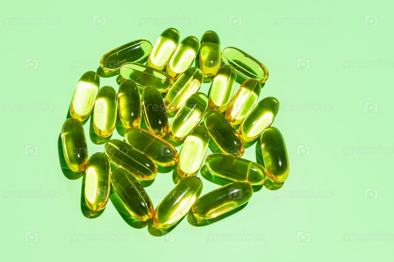 Золотые желатиновые капсулы, сложенные в круг, натуральное масло омега жирных кислот на зеленом фоне. Вид сверху. питание и омоложение организма