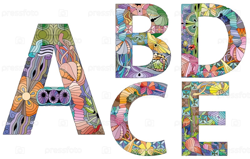Вектор нарисованного от руки набора алфавита от A до E в стиле Zentangle