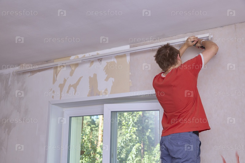 Мужчина чинит карниз над окном в рамках проекта реконструкции