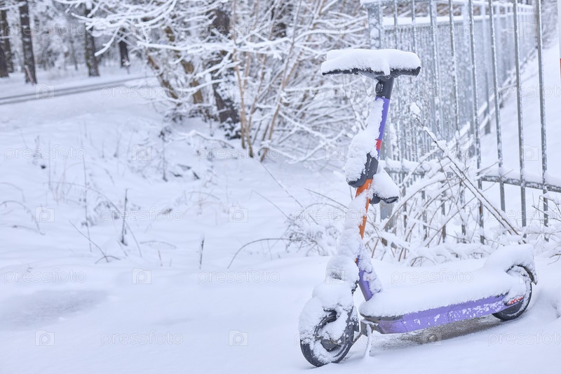 Зимняя тишина окутывает забытый электросамокат — трогательная сцена городской жизни, приостановленной обильным снегопадом, вызывающая чувство тихой изоляции