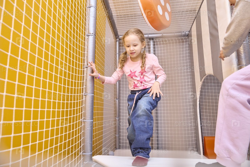 Маленькая девочка перемещается по красочному лабиринту на игровой площадке