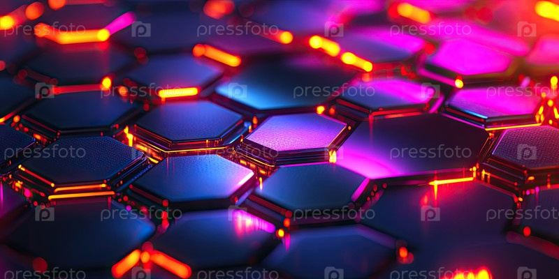Футуристический шестиугольный узор с голографическими цветами и переливающимися отражениями в элегантном дизайне