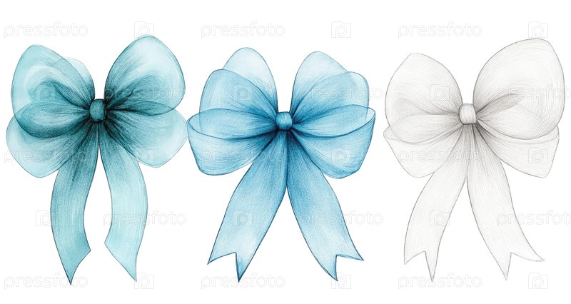 Эта коллекция демонстрирует три элегантных банта с струящимися лентами в оттенках синего и белого. Идеально подходит для добавления декоративного штриха к поделкам или дизайнерским проектам