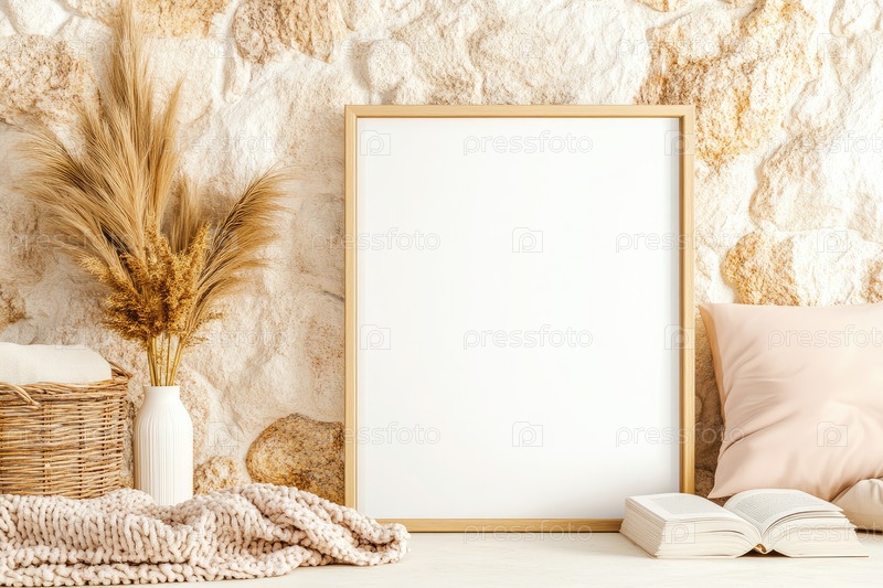 Минималистский макет пустого белого плаката в рамке на фоне уютного уголка для чтения у каменной стены
