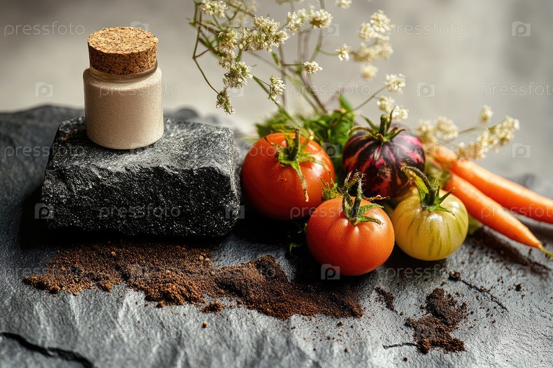Свежие помидоры-реликвии и радужная морковь, разложенные на фактурном камне, демонстрируют концепцию «от фермы до стола». Сельские травы добавляют землистых тонов, создавая спокойную, минималистичную эстетику