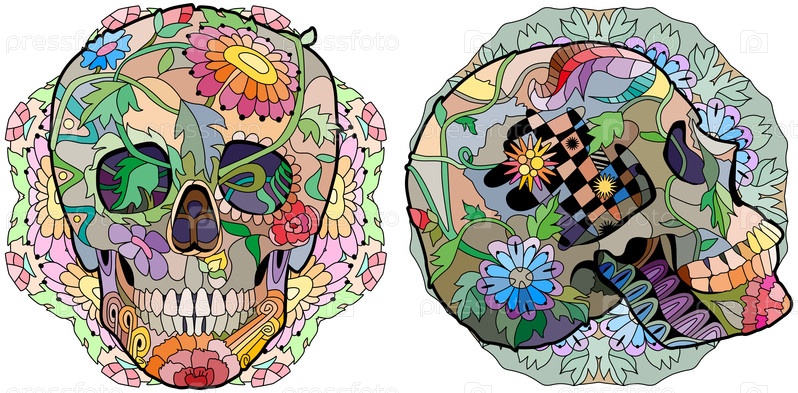 Два черепа вид сбоку и вид спереди на мандале с цветочным орнаментом иллюстрации. Цвет и контур набор