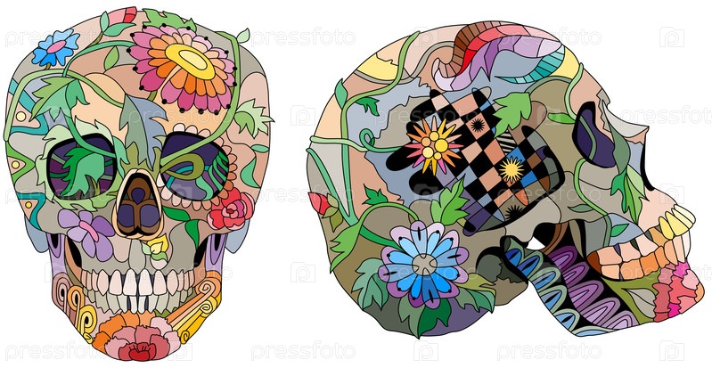 Zentangle стилизованные два черепа вид сбоку и вид спереди. Нарисованная вручную декоративная векторная иллюстрация