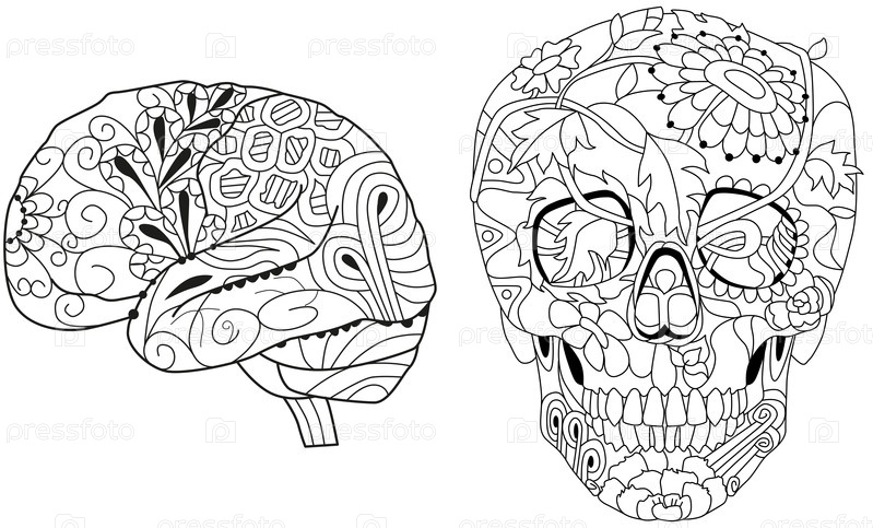Мозг и череп с цветочным орнаментом, иллюстрация для раскрашивания