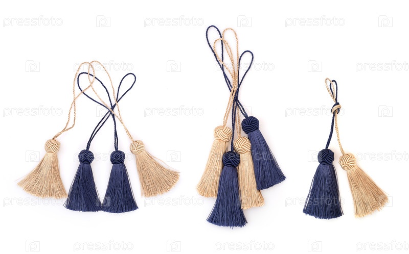 Синие и золотистые шелковые кисточки, изолированные на белом фоне для создания графических концепций