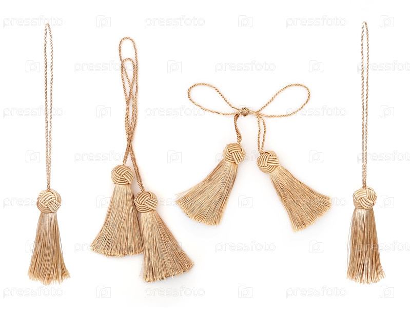 Две золотые шелковые кисточки, изолированные на белом фоне, для создания графических концепций