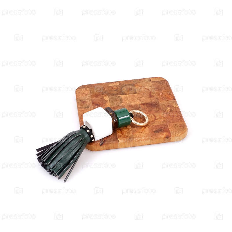 Деревянная поверхность с кожаным брелком в проекции, изолированной на белом фоне