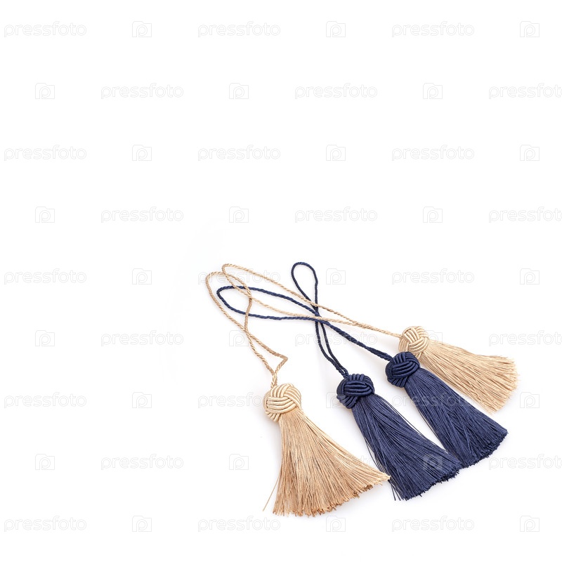 Синие и золотистые шелковые кисточки, изолированные на белом фоне для создания графических концепций