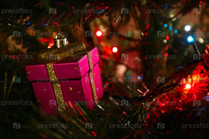 Украшения на елку: подвесные блестящие красные и золотые подарочные шары и разноцветные огни