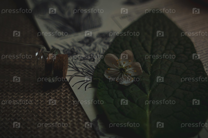 Мистический натюрморт в винтажном стиле с пустыми колбами, горящими свечами, письмами и газетными вырезками