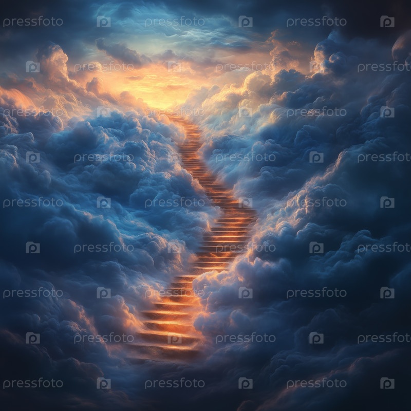 Лестница, ведущая сквозь облака к сияющему свету в небе. Путь на небеса