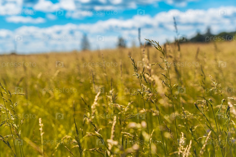 Солнечное поле высокой травы с голубым небом