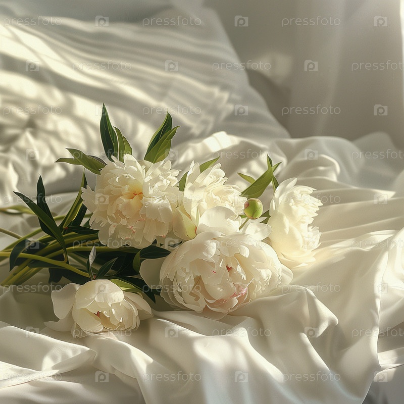 Букет белых пионов, лежащий на кровати утром
