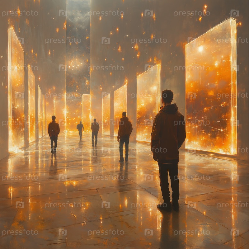 Люди исследуют футуристический зал со светящимися порталами